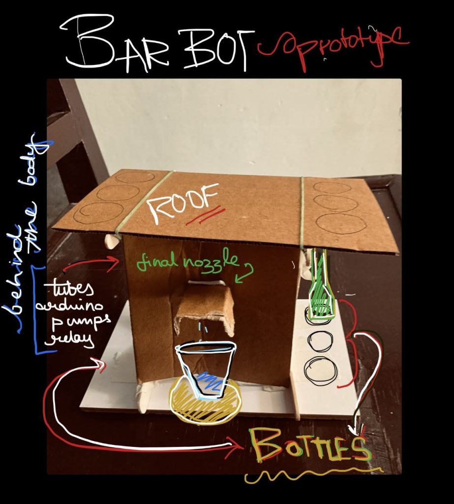 BarBot is an automated machine that will be designed to mix various ingredients to create a cocktail based on user input. The user will select the type of cocktail through a user interface (mobile app). The Barbot will wait for a cup to be placed underneath the dispenser, after which it will then dispense the exact measurements of the ingredients into a glass. The prototype will include a precise liquid dispensing system, an interactive user interface, and an aesthetically and ergonomically pleasing design.