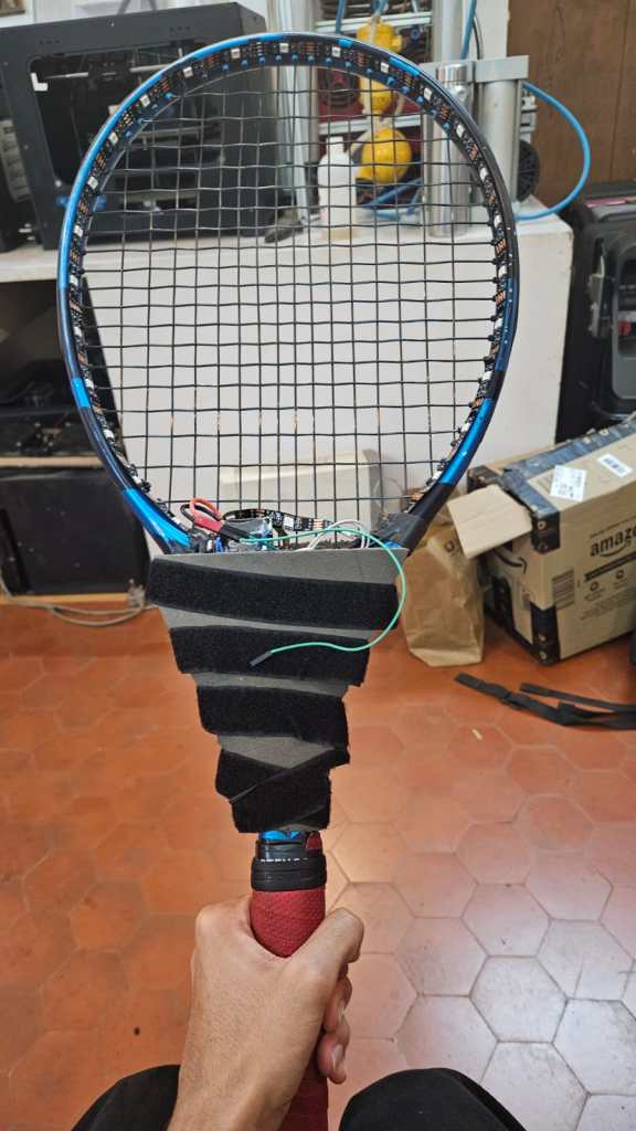 To bridge this gap, we propose the development of a Smart Tennis Racket, which integrates sensor-based analytics to track shot acceleration in real-time. By using an MPU6050 accelerometer and gyroscope, the racket captures motion data and transmits it wirelessly using an ESP32 microcontroller. Additionally, an LED RGB strip visually represents shot intensity, providing instant feedback to the player.